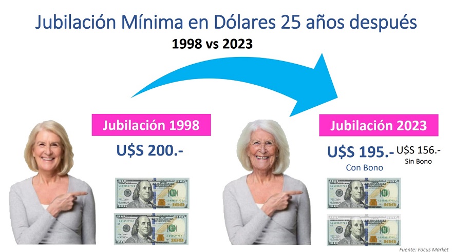 Según Focus Market, el haber correspondiente a los jubilados con la mínima hace 25 años representaba alrededor de 200 dólares. Sin embargo, 25 años después, ese mismo haber se traduce en u$s 195 (si se incluye el bono extra entregado por el Gobierno hasta este mes de febrero). Si se compara el ingreso mínimo por jubilaciones sin ese refuerzo, el ingreso disminuye hasta los 156 dólares.