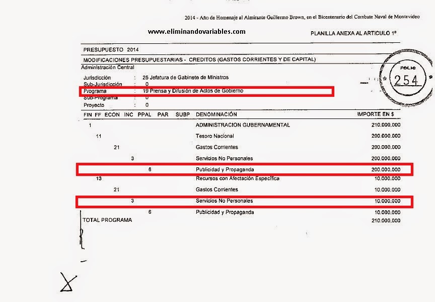 Como sucedió en otros momentos de crisis, el gobierno kirchnerista decidió buscar una solución en la propaganda oficial. Por eso el gasto adicional presupuestario en comunicación gubernamental se incrementó, en siete meses del 2014, un total de 501 millones de pesos, de acuerdo con un relevamiento realizado por (Eliminando Variables), basado en documentos oficiales.