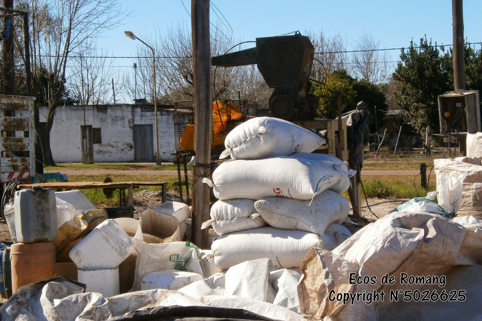 La máquina funciona moliendo bidones vacíos de agrotóxicos y silos bolsas, todos de uso en los semabradíos de soja de la zona, sin ningún tratamiento, y el agua contaminada la desechan directamente al zanjón, que bordea toda la manzana.